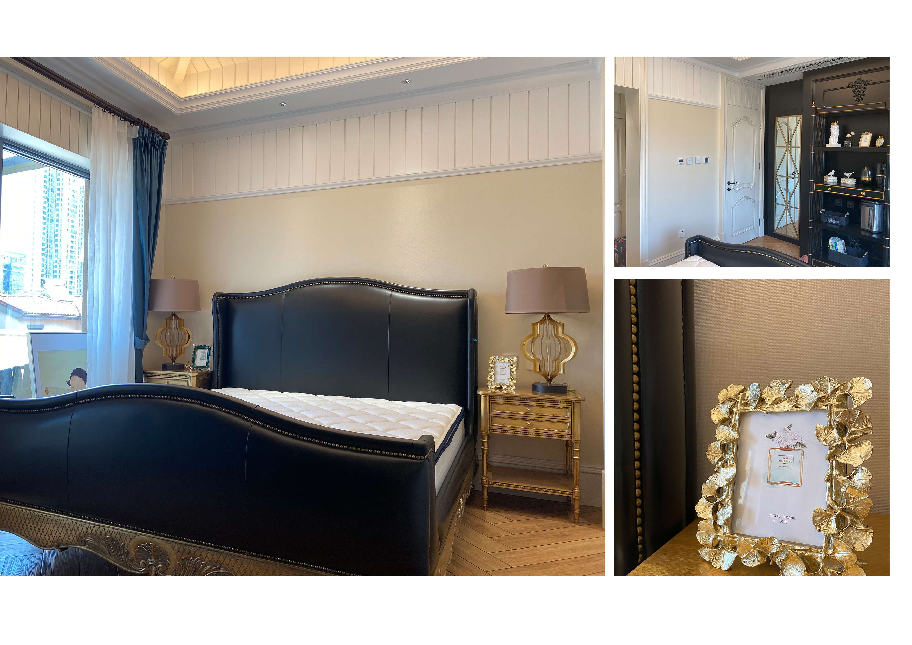 在主臥室中,沿用棕黃色基調(diào),金色點(diǎn)綴,搭配美式臺(tái)燈,保證了室內(nèi)空間的魅力迷人。經(jīng)典黑,嚴(yán)肅和深度絕對(duì)