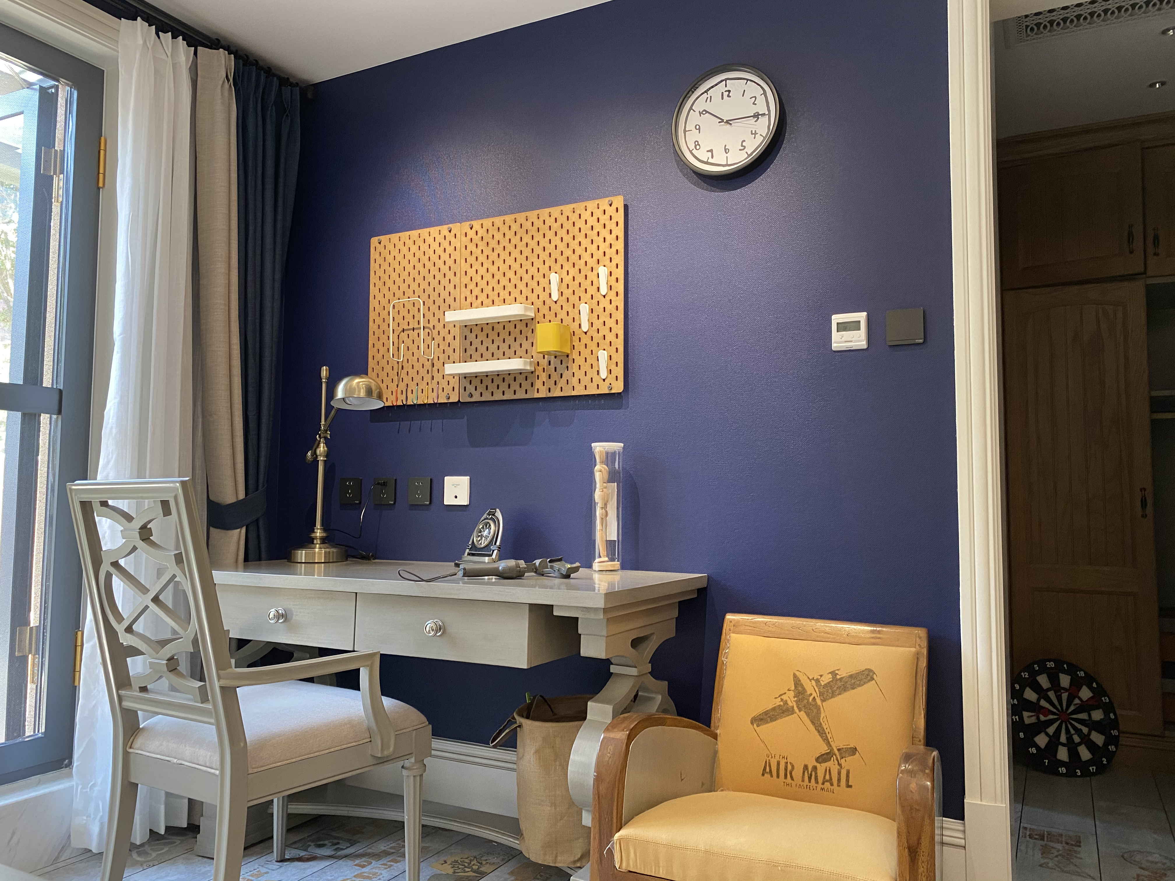 暖色調(diào)為主,美式現(xiàn)代為基底,墻面使用維圖藍(lán)CF764,沒有喧賓奪主,與木色地板相呼應(yīng),層層遞進(jìn)、疊加,讓